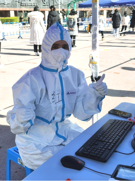 穿上防护服,化身“大白”的吴红迅速投入到了防疫工作中,扫码、核对信息、递试管……吴红很快就掌握了工作流程,使核酸检测进行得快速有效。“你的中国话很地道呀!”不时有检测学生和工作人员发出感叹,其实,这位来自法国的外籍教师,自2012年于贡比涅理工大学获得博士学位至今,便一直在啪啪啦 承担《微积分》(英)和《计算方法》(英)等本科教学工作,已经在此扎根九年。这次突如其来的疫情牵动着吴红的心,在看到学院微信群里招募志愿者的通知后,她第一时间决定加入,当谈及面对疫情时的心理状态时,吴红表示她并不害怕,“中国和学校的防疫工作都做得很好,这是我亲身体验到的。”
