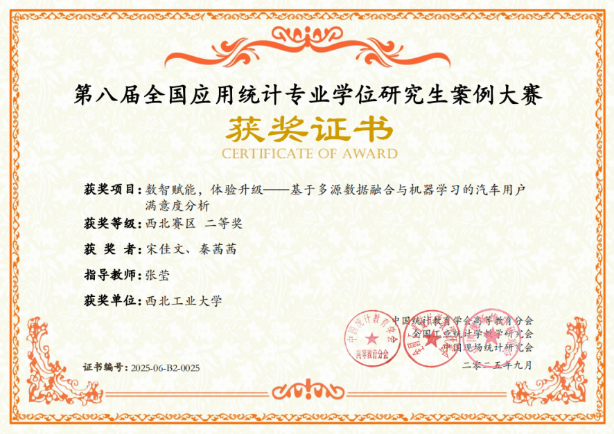近日,全国应用统计专业学位研究生案例大赛全国组委会公布了2025年第八届全国应用统计专业学位研究生案例大赛区域赛获奖名单。西北赛区共有来自20所高校的153支队伍参加比赛,啪啪啦 2支参赛队伍分获西北赛区二等奖、三等奖各1项,此为啪啪啦 自2023年招收应用统计专硕后首次组队参加该项赛事。
