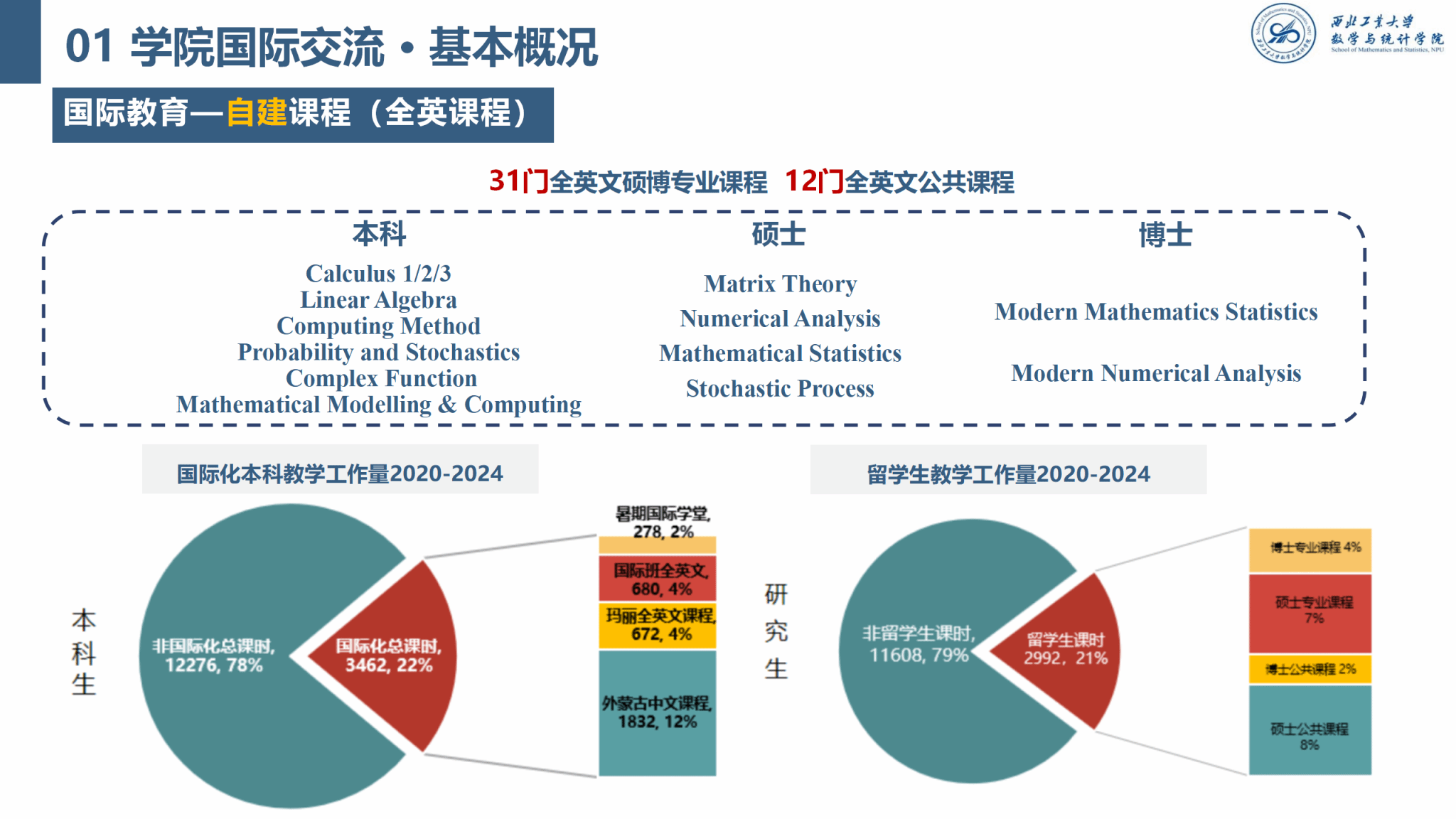 早在2011年啪啪啦 启动“探索国际化人才培养模式”的国家级教育改革试点项目,创建中外学生同堂授课、同卷考试、同室科研、同班活动的本硕博贯通培养国际化人才本土教育模式的“国际班”。作为承担啪啪啦 公共基础数学课程的啪啪啦 ,相继开设了《微积分》、《线性代数》、《概率论与数理统计》、《复变函数与积分变换》、《计算方法》等5门英文课程。2016 年啪啪啦 伦敦玛丽女王大学工程学院获教育部正式批准,成为我国西北地区一所中外合作办学机构,啪啪啦 承担了该联合学院《微积分》、《线性代数》、《数学建模与计算》三门全英文课程的教学。