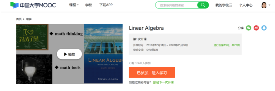 1.Linear Algebra(线性代数)国际爱课程平台课程链接,可进入课程介绍页,参加学习: