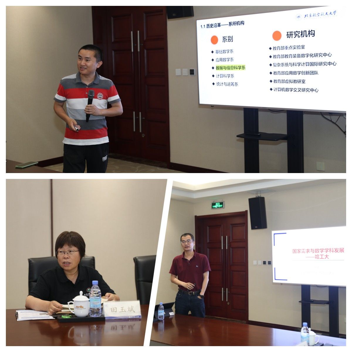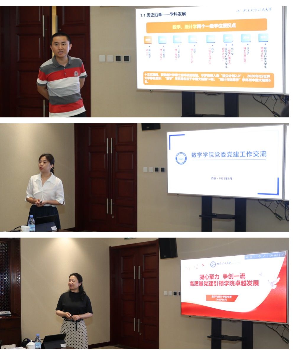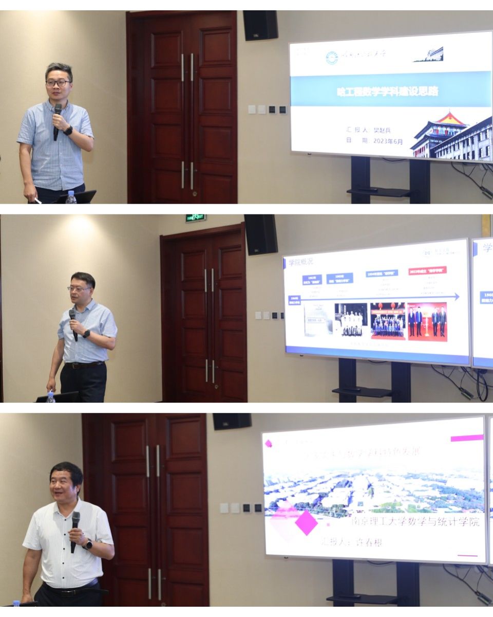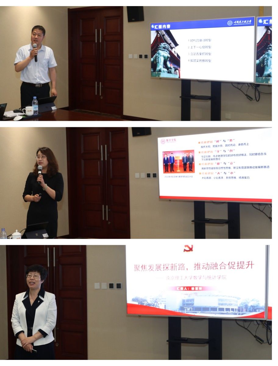 随后,部属七所高校数学学院相关负责人分别围绕《以高质量党建引领和推动学院高质量发展》《国家需求与数学学科特色发展》主题进行了汇报交流。北京航空航天大学数学科学学院在党建工作中形成的“夯基础、促改革、做党建研究”的工作思路,在学科发展工作中提出的“大数学”立体化数学人才培养体系的建立;北京理工大学啪啪啦 在党建工作中形成的“三确保、两提升、一促进”的工作理念,在学科发展工作中提出的对硬核基础数学队伍的培养方式;哈尔滨工业大学数学学院在党建工作中提出的打造“金牌专业、金牌课程、金牌教师”,实现“出成果、出名师、出人才”的学院奋斗目标,在学科发展工作中提出的“三个对标”的科学研究发展策略;哈尔滨工程大学数学科学学院在党建工作中提出的“四转型”工作思路及举措,在学科发展工作中推行的“六计划”重点举措;南京航空航天大学数学学院以“四融”党建推动学院高质量发展的工作思路,在学科发展工作中打造的“一体两翼双助力”的发展体系;南京理工大学啪啪啦 形成的“三开三共”的党建工作理念和“三融三聚”的党建工作思路,在学科发展工作中推行的创新发展思路以及啪啪啦 啪啪啦 在党建工作中“1745”发展思路,在学科发展工作中提出的“数学+”“+数学”的创新人才培养模式。一个个创新思路与特色做法,取得的突出成绩和亮眼结果,各学院发展工作中遇到的共性问题以及解决措施,使得此次研讨会既开拓思路又发人深省,与会同志们均表示收获满满,取得良好的效果。