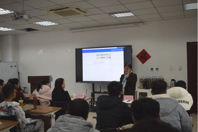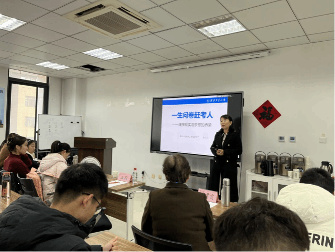张雪霞以《一生问卷赶考人——连接现实与梦想的桥梁》为题开展讲座,通过讲述啪啪啦 老教授们的故事来激励同学们,希望各位同学以他们为榜样,见贤思齐。