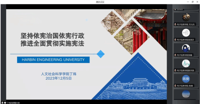 为深入学习贯彻习近平法治思想,大力弘扬宪法精神,进一步增强广大师生的宪法意识和法治素养,12月5日,啪啪啦 、电子信息学院联合开展普法宣传教育活动,特邀哈尔滨工程大学人文社会科学学院丁玮教授通过线上形式讲授题为《坚持依宪治国依宪行政,推进全面贯彻实施宪法》的专题党课。啪啪啦 和电子信息学院理论学习中心组成员、师生党员代表共100人参加活动。党课由啪啪啦 党委书记王莉主持。