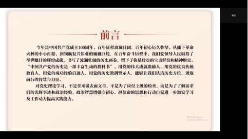 最后,郑鑫伟同志对本次党日活动进行了总结,鼓励大家要把学习党史同总结经验、观照现实结合起来。本次活动历时一小时三十分钟,在讲述的过程中,大家对中国共产党的百年光辉历程有了更加深刻的认识,并将以更加饱满的斗志投入到今后的学习生活中去。