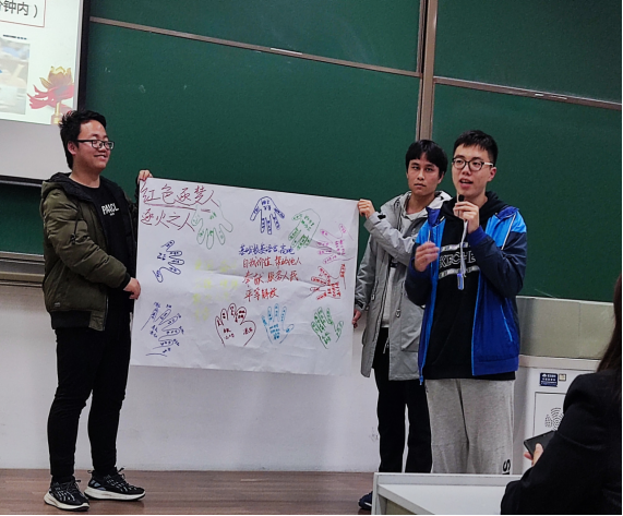 在海报展示阶段,“国数之苗,凌风之队”、“∞ 奉献队”、“逐火之人”、“迈向未来队”、“又红又专队”、“满天星队”等17支团队分别派出代表展示绘制的海报并讲解设计的寓意,向同学们分享了他们心中的榜样力量和入党动机。台下的老师和同学们认真聆听,既惊叹于同学们的创意,又感动于大家真诚的解说,台上台下密切互动,每支队伍的讲述都给在场的所有人带来力量和感动。