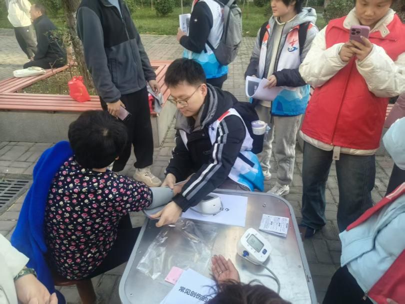 讲座结束后,志愿者们在社区活动室为居民提供健康检测与急救知识指导。大家耐心为老人与孩子测量血压,细致讲解血压指标含义,并结合常见健康问题提供生活建议。在校红十字会成员的协助下,志愿者们还现场演示了心肺复苏(CPR)的基本操作,包括按压部位、频率与注意事项等。居民们在指导下积极参与实操练习,现场学习氛围专注而热烈,不少居民表示“真正掌握了关键时刻能派上用场的技能”。