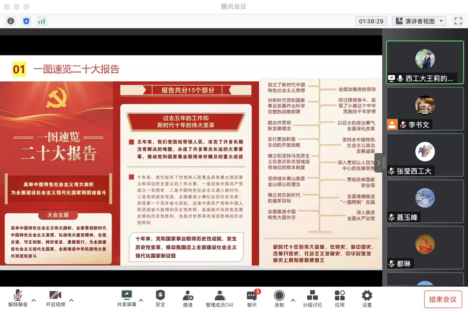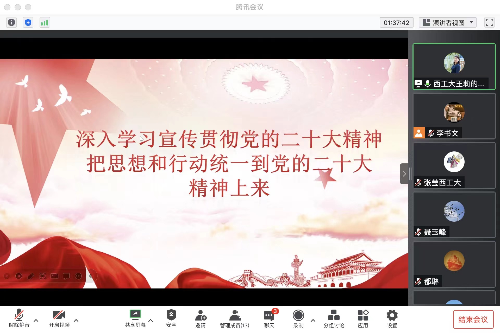 10月27日啪啪啦 党委理论学习中心组通过线上会议开展了学习贯彻党的二十大精神专题学习研讨扩大会,学院党委理论学习中心组成员、院长助理、教职工党支部书记参加了会议,会议由学院党委书记王莉主持。