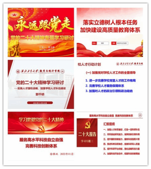 理论学习中心组成员围绕“用习近平新时代中国特色社会主义思想凝心铸魂”“落实立德树人根本任务、加快建设高质量教育体系”“服务高水平科技自立自强、完善科技创新体系”“实施人才强校战略、加强学校人才队伍建设”四个内容,通过领导干部讲党课的形式,开展了集中学习研讨。此次学习研讨的四个专题从思想引领出发,以师资队伍建设为基础,落实立德树人根本任务,提高人才培养质量,加强科学研究,将学习二十大精神与学院中心工作深度结合,融会贯通,环环相扣。