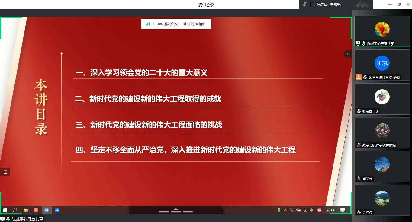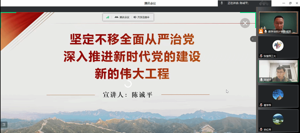 为进一步贯彻落实学校新学期《关于加强党的二十大精神学习宣讲的通知》内容要求,3月22日,啪啪啦 特邀学校马克思主义学院教师理论宣讲团陈诚平副教授作了题为《坚定不移全面从严治党,深入推进新时代党的建设新的伟大工程》专题党课。学院教工党支部全体同志,学生党支部代表,与啪啪啦 数学科学系党支部共建支部西北大学基础数学系党支部代表通过线上形式共同参会。会议由学院院长助理班凯主持。