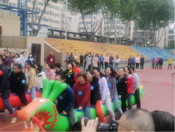 最后一个项目是“欢乐贪吃蛇”。赛场上,每位老师都表现出了顽强的意志和拼搏精神。大家都鼓足了劲、涨红了脸,抓着前面老师的衣服全力以赴奔跑。现场加油声、欢呼声,此起彼伏,将比赛的气氛拉到了最高潮!