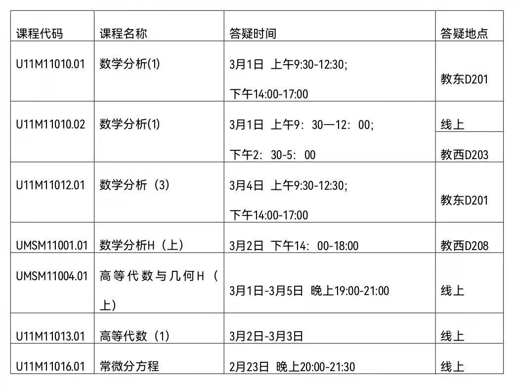 根据学校教务处考试安排,2021-2022秋季学期延期考试的课程将于2月28日-3月6日进行,啪啪啦 延期考试的课程将于本周开始进行考前答疑。各专业课程考前答疑时间安排如下: