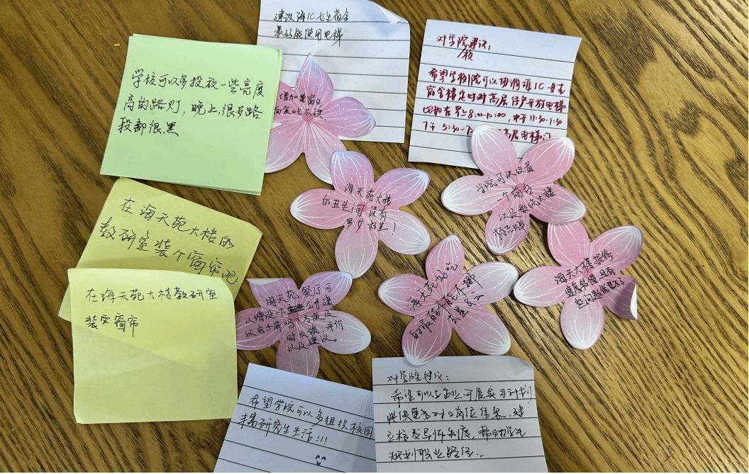 座谈会上现场征集了同学们对学院的意见和建议,这些反馈内容广泛,涵盖了从日常生活到学习环境的各个方面,包括教研室光照不足、教室设施维修以及职业发展规划支持等问题。每一条建议都凝聚着同学们对改善校园生活的热切期望与积极态度。针对大家关心的各项议题,杜乔同学详细记录并承诺会及时将这些问题反馈给学院相关部门,确保每一个声音都能得到重视。