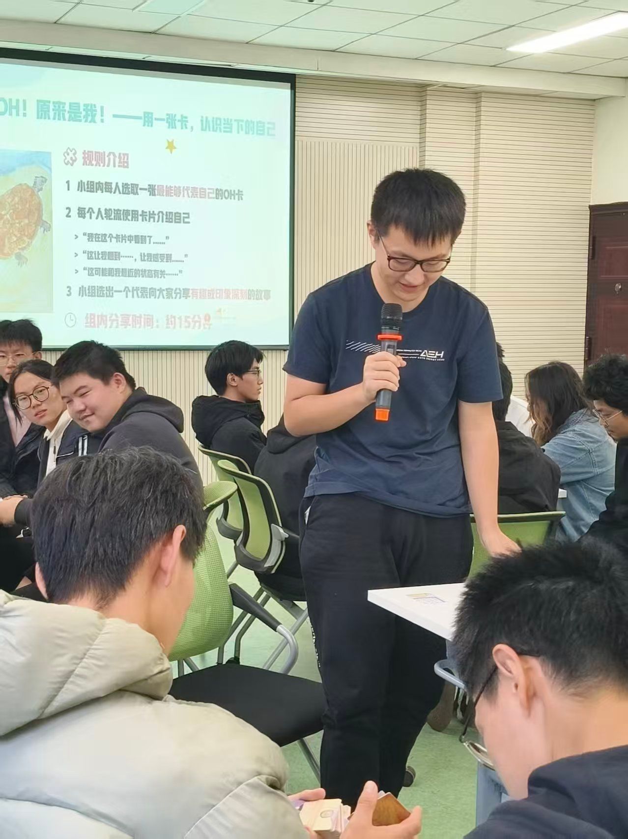 在接下来的核心环节,郭老师围绕“个体-协作-默契”梯度依次展开。“OH卡自我介绍”“默契大比拼”“真人扫雷”等环节,既建立小组内部信任与理解,促进情感表达,又增强了小组凝聚力、加强合作与协调。