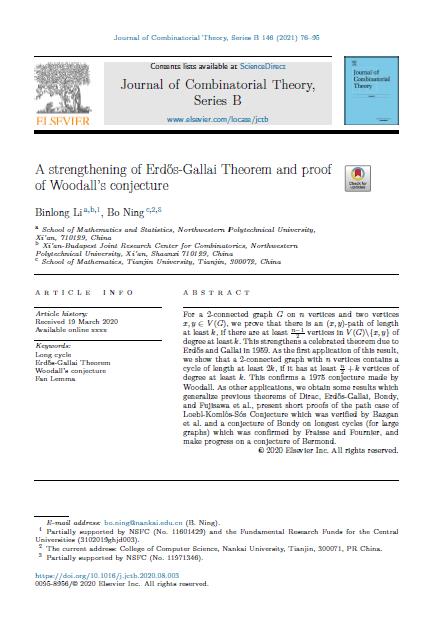 Woodall猜想是由英国诺丁汉大学Douglas Woodall教授于1975年提出的关于图中存在长圈条件的一个猜想。该猜想被JCTB期刊前主编Bondy和Murty作为图论中50个未解决问题中的一个收录在经典图论教材《Graph Theory with Applications》中,受到包括伦敦玛丽女王大学Bill Jackson教授、瑞典于默奥大学Roland Häggkvist教授和法国国家研究中心李皓主任研究员等多名国际知名图论专家的重视,开展相关的研究工作。李斌龙和宁博引入了边置换操作,改进了著名数学家Paul Erdős和Tibor Gallai关于长路的经典结果,最终彻底证明了Woodall猜想。审稿人评价该成果给出了Woodall猜想一个干净的证明(a neat proof),具有重大价值(substantial),对很多研究者有用(useful for many researchers)。
