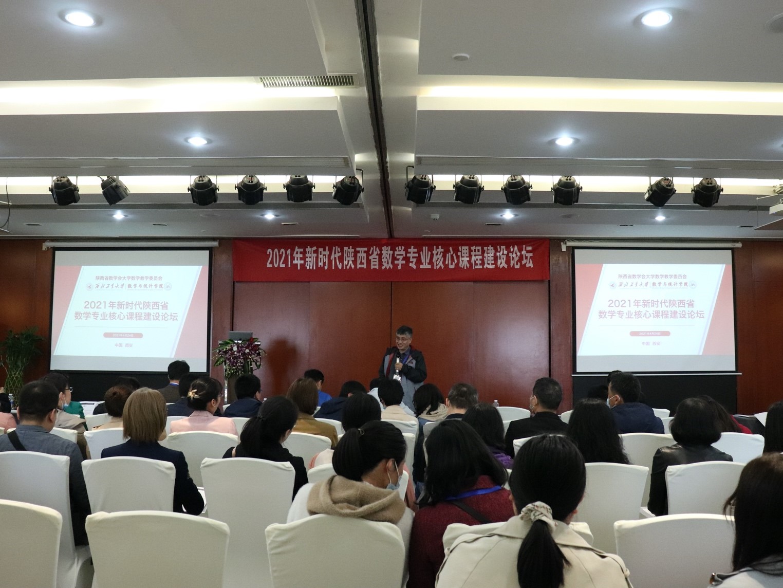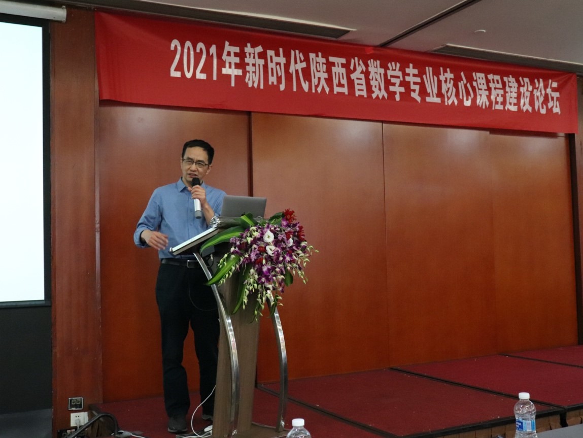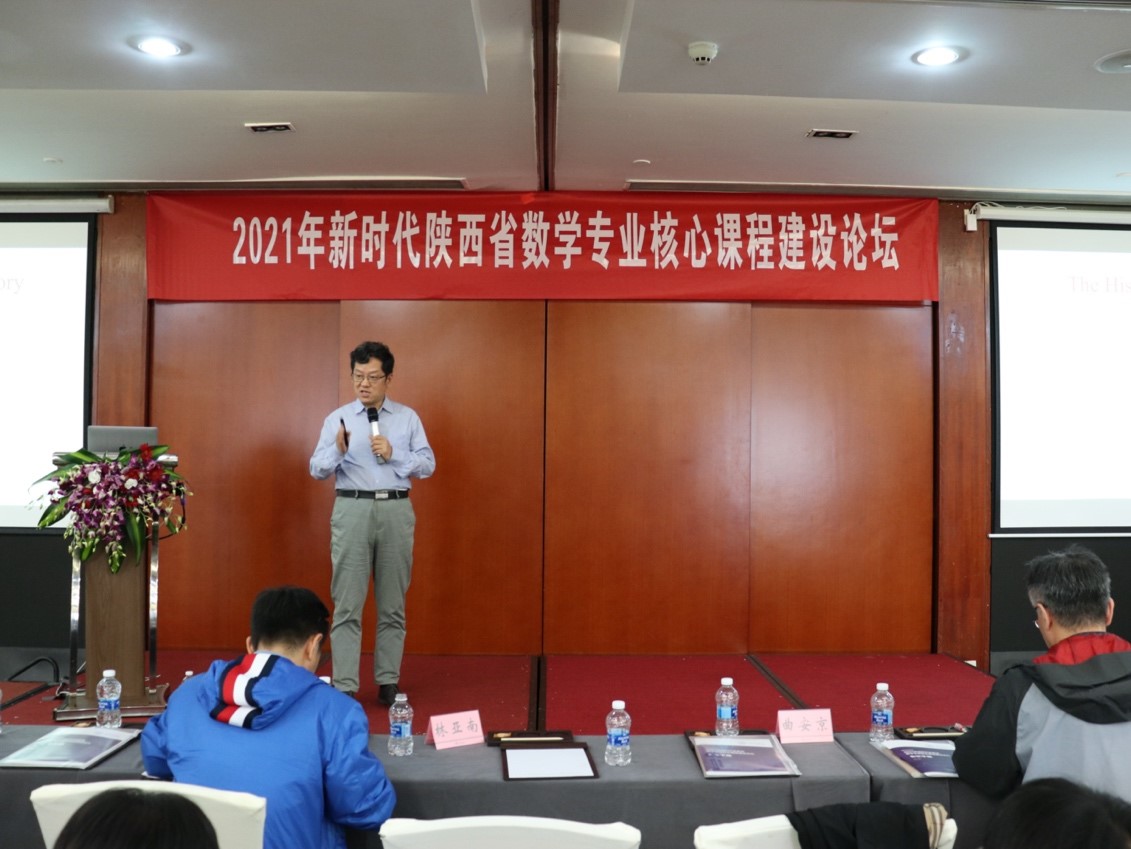由陕西省大学数学教学委员会主办,啪啪啦 承办的新时代陕西省数学专业核心课程建设论坛,于2021年4月24日下午在西安市高新区志诚丽柏酒店20楼多功能厅召开。本次论坛旨在加强陕西地区数学专业核心课程建设、促进陕西高等院校数学核心课程教师之间的交流。会议邀请了厦门大学林亚南教授、中国科技大学赵卿教授、西北大学曲安京教授进行报告。来自西安、宝鸡、杨凌、兰州、银川等地的26所高校130余位高校数学课程负责人及教师参加了本次论坛。