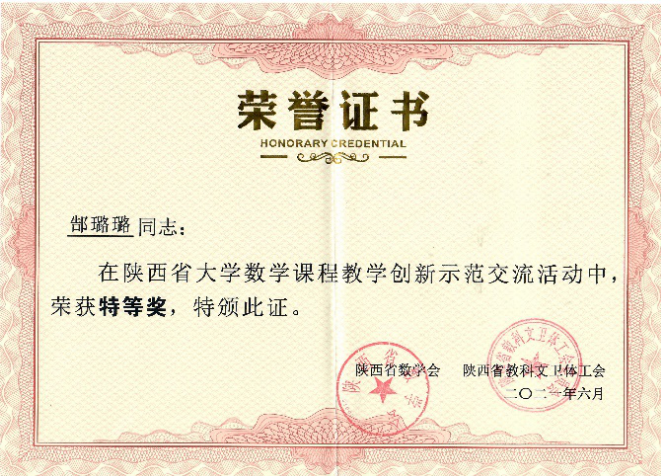 郜璐璐老师从“中国古代数学家和微积分”的角度进行了课程思政,包括刘徽的割圆术、祖冲之的圆周率和李善兰的《代微积拾级》等,希望能够激发学生的文化自信、民族自豪感和锲而不舍的探索精神,该案例在陕西省大学数学课程教学创新示范交流活动中荣获特等奖。