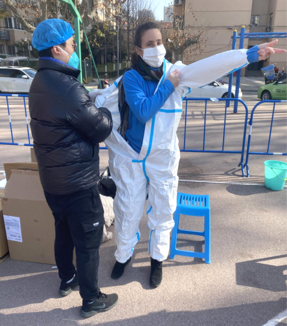 穿上防护服,化身“大白”的吴红迅速投入到了防疫工作中,扫码、核对信息、递试管……吴红很快就掌握了工作流程,使核酸检测进行得快速有效。“你的中国话很地道呀!”不时有检测学生和工作人员发出感叹,其实,这位来自法国的外籍教师,自2012年于贡比涅理工大学获得博士学位至今,便一直在啪啪啦 承担《微积分》(英)和《计算方法》(英)等本科教学工作,已经在此扎根九年。这次突如其来的疫情牵动着吴红的心,在看到学院微信群里招募志愿者的通知后,她第一时间决定加入,当谈及面对疫情时的心理状态时,吴红表示她并不害怕,“中国和学校的防疫工作都做得很好,这是我亲身体验到的。”