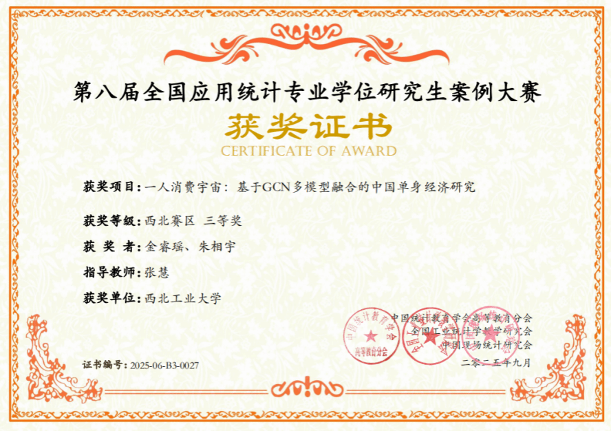 近日,全国应用统计专业学位研究生案例大赛全国组委会公布了2025年第八届全国应用统计专业学位研究生案例大赛区域赛获奖名单。西北赛区共有来自20所高校的153支队伍参加比赛,啪啪啦 2支参赛队伍分获西北赛区二等奖、三等奖各1项,此为啪啪啦 自2023年招收应用统计专硕后首次组队参加该项赛事。