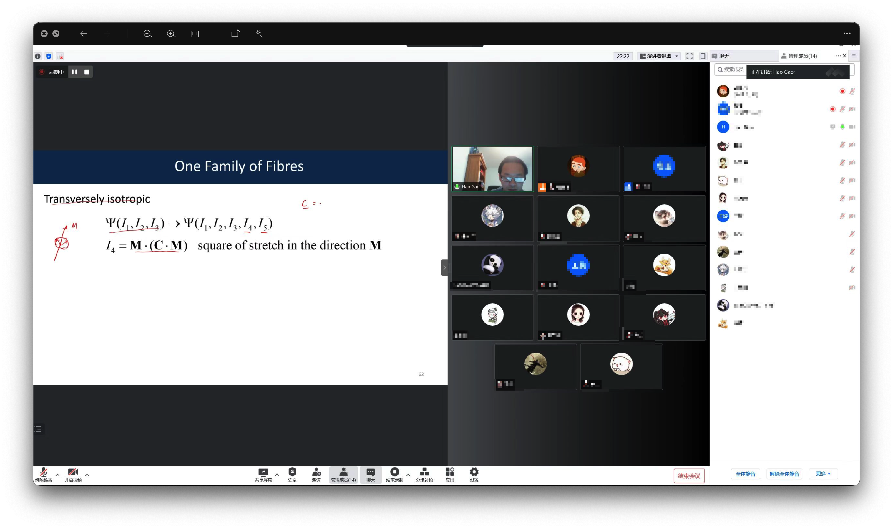 2022年6月28日14:00,暑期国际学堂《心脏力学:非线形弹性理论与计算》在腾讯会议云上开课,该课程为期4天,分别为6月28和30日,7月20和22日。授课教师是来自格拉斯哥大学啪啪啦 的应用数学研究员Gao Hao。该课程参与者近20人。