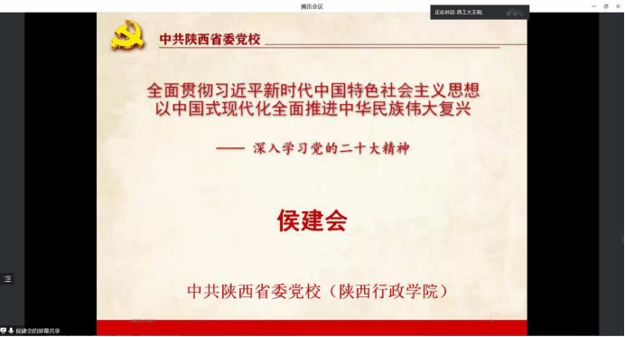 12月1日,啪啪啦 邀请中共陕西省委党校(陕西行政学院)侯建会教授作党的二十大精神专题辅导报告。辅导报告通过线上视频的方式开展,学院党委书记王莉主持,学院领导班子成员、教职工党员、学生党员代表共计100余人参加本次报告会。
