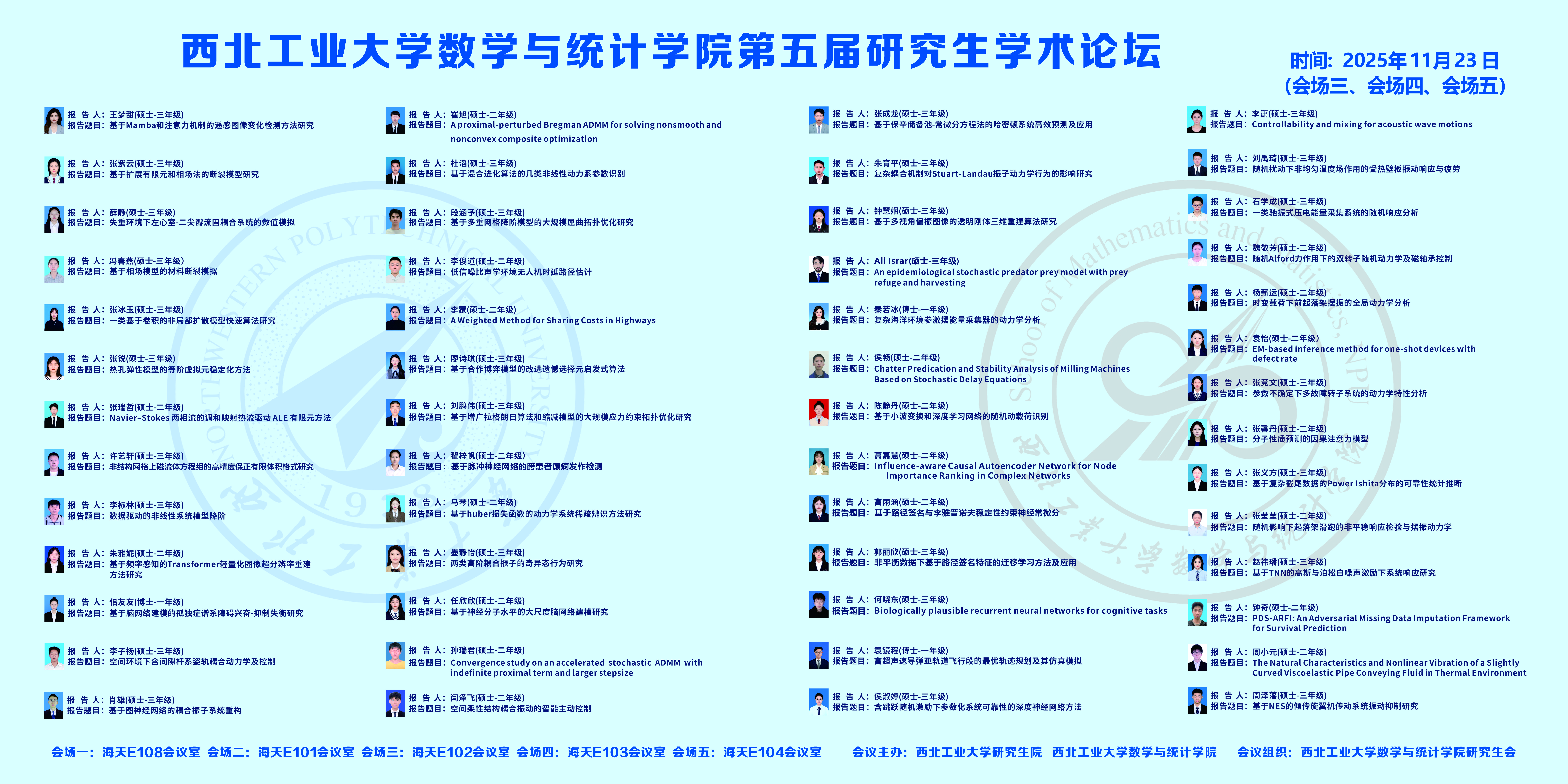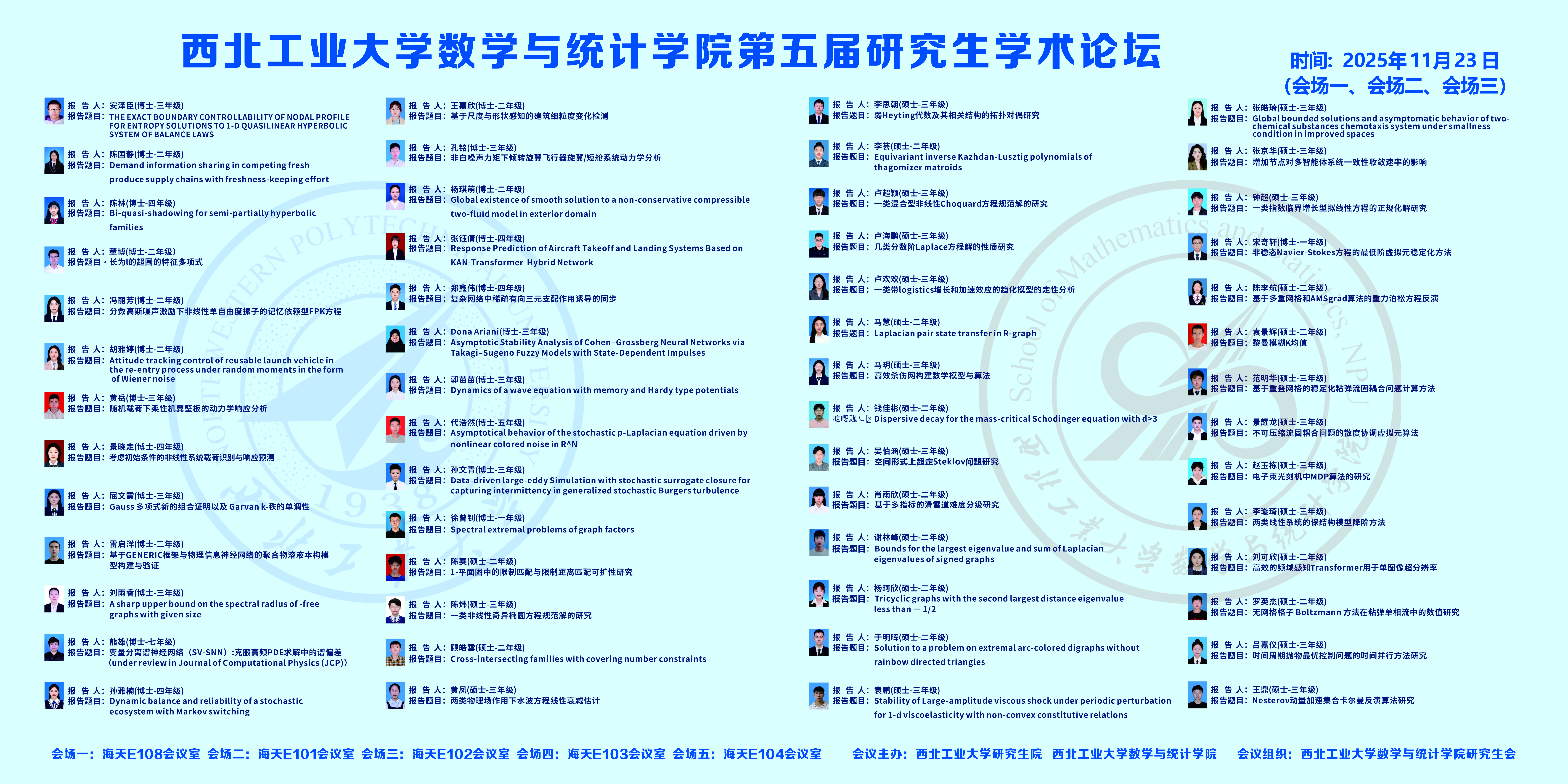 为了进一步落实数学学科“双一流”建设,营造研究生学术创新氛围,展示研究生学术创新成果,提高研究生培养质量,啪啪啦 第五届研究生学术论坛将于2025年11月23日在啪啪啦 长安校区举办。本次论坛旨在为研究生提供一个高水平的学术交流平台,促进研究生之间的学术交流和思想碰撞,培养创新意识,营造良好的学术氛围,达到开阔视野、启迪智慧,提高创新能力的目的。