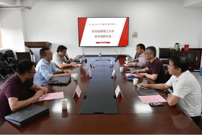 聂玉峰从学院历史沿革、师资概况、数学拔尖人才和“总师型”人才培养、科学研究、国际合作等方面做了重点介绍,并就学院近几年取得的成果分享了工作开展思路和经验方法。刘浏介绍了成都理工大学数理学院发展历程、专业建设、师资状况、人才引进等方面的情况。双方围绕数学学科建设、人才培养、科学研究等方面进行了深入细致的交流。