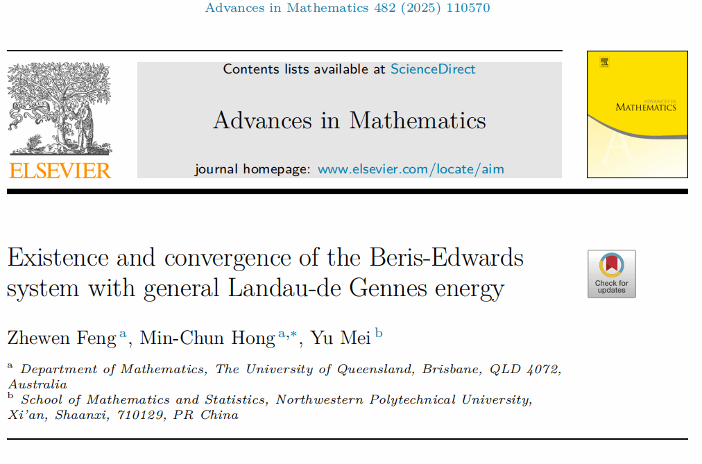 近日, 啪啪啦 梅钰副教授与澳大利亚昆士兰大学冯哲文博士、洪敏纯教授合作,在液晶流Beris-Edwards系统强解的存在性与收敛性方面取得重要进展。研究成果形成79页论文“Existence and convergence of the Beris-Edwards system with general Landau-de Gennes energy”在数学综合期刊《Advances in Mathematics》上在线发表。按国际惯例,论文作者依姓名字母顺序排列。