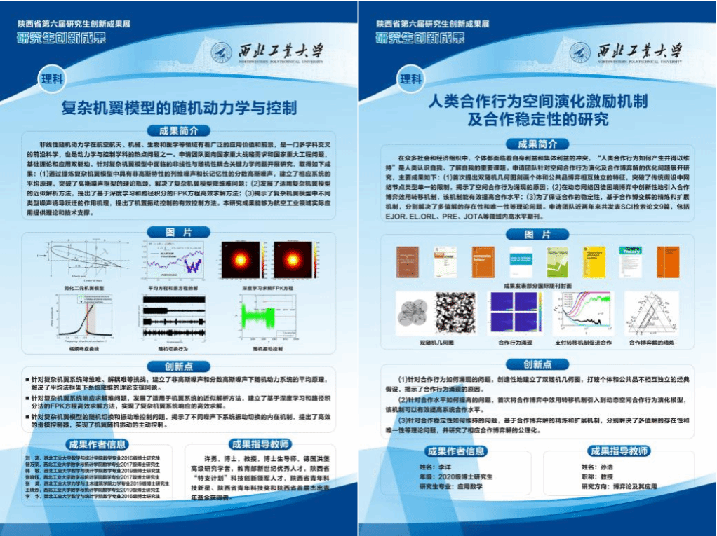 近日,陕西省教育厅、陕西省学位委员会公布了陕西省第六届研究生创新成果展奖项评选结果,啪啪啦 积极动员申报,共推选5项,获奖2项,其中“复杂机翼模型的随机动力学与控制”(刘琪等)荣获理科组一等奖,“人类合作行为空间演化激励机制及合作稳定性的研究”(李洋等)荣获理科组二等奖。