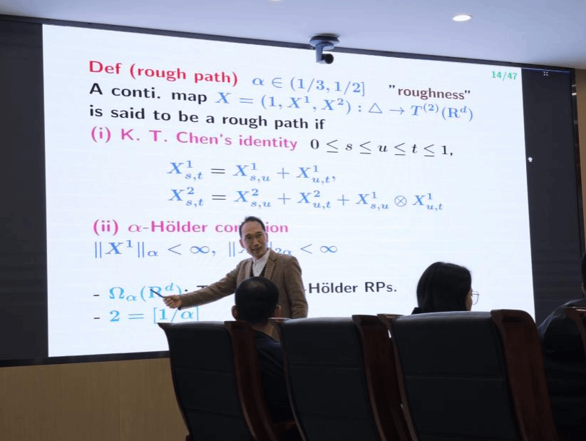 Yuzuru Inahama的报告聚焦于粗糙路径理论,对这一学科进行了深入而全面的阐述。与传统的伊藤随机微积分理论不同,粗糙路径理论摆脱了随机过程增量独立性和马氏性的理论限制,它不依赖于概率框架,而是从路径的角度为理解由“粗糙”的轨道驱动的非线性随机系统提供了强大的理论基础。Inahama在演讲中深入探讨了多个方面,包括受控常微分方程、几何粗糙路径、粗糙微分方程以及受控路径的Gubinelli理论等。本次讲堂的举办活跃了啪啪啦 师生在粗糙路径理论方面的学术交流,更拓宽了师生的研究视野。