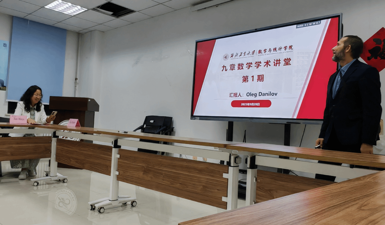 为深入贯彻落实《啪啪啦 科技工作高质量发展行动计划》,切实活跃学院科研交流氛围,提升有组织科研能级,啪啪啦 开展“九章数学系列学术报告”活动。2023年9月28日,第一期“九章数学学术讲堂”在启翔楼357进行,讲堂邀请俄罗斯新西伯利亚国立大学Oleg Danilov教授主讲,啪啪啦 党委书记王莉、院长聂玉峰、副院长都琳、国际交流与合作办公室主任肖曼玉等20余位教师和学生参会,会议由肖曼玉主持。