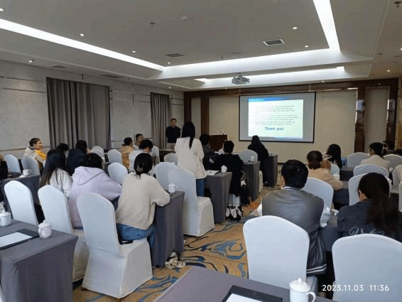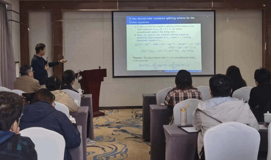 首先,王晓东对于沈捷教授进行了简要介绍,接着,沈捷介绍了传统时间离散格式在处理强刚性问题时的局限性。为解决这种局限性,构造了一种新的针对耗散系统的高刚性稳定时间离散格式,并介绍了该格式在Navier-Stokes方程中的应用。沈捷的报告引人入胜、思路清晰,赢得了现场听众的高度评价和认可。参会的青年教师和学生们也积极提问交流,现场气氛十分活跃。