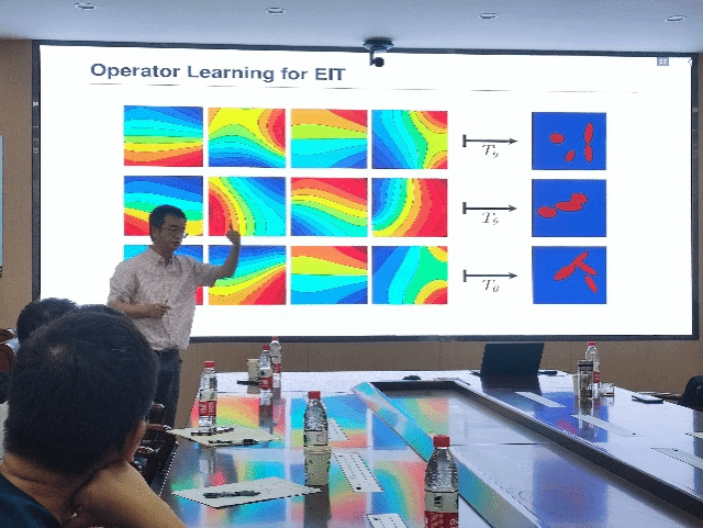 在报告中,陈龙教授首先介绍了电阻抗成像问题以及数学上已经发展出的直接采样法。其次,陈教授介绍了深度神经网络的相关知识、以及与传统的CNN不同的Transformer模型。然后,陈教授阐述了基于Transformer的算子学习方法。最后,陈教授提出了一种基于Transformer的深度直接采样方法并详细介绍了方法的构造过程。报告结束后,陈龙教授就报告内容与参会的师生展开了激烈的交流和讨论。