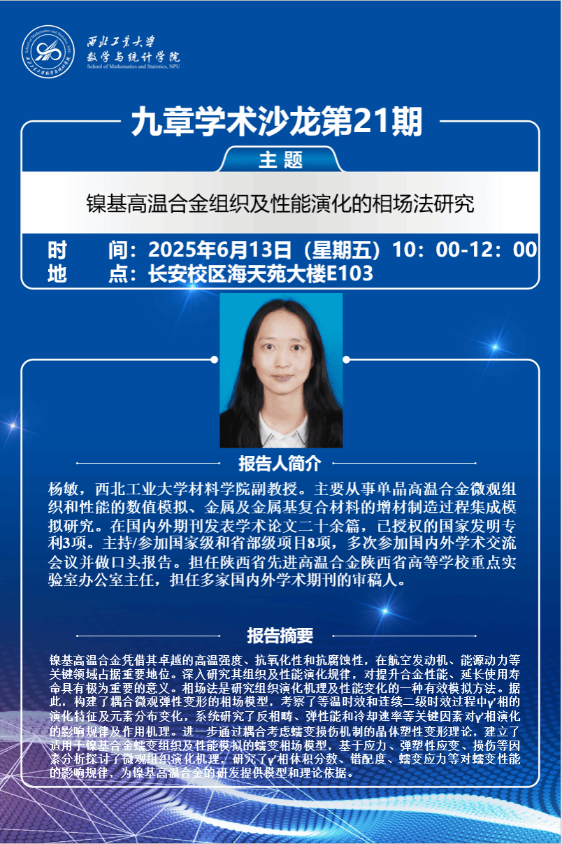2025年6月13日,应啪啪啦 副院长都琳教授及王晓东教授邀请,材料学院杨敏副教授在海天苑大楼E103会议室作了题为《镍基高温合金组织及性能演化的相场法研究》的学术报告。学院近20位师生参会共探学术前沿,报告由都琳主持。