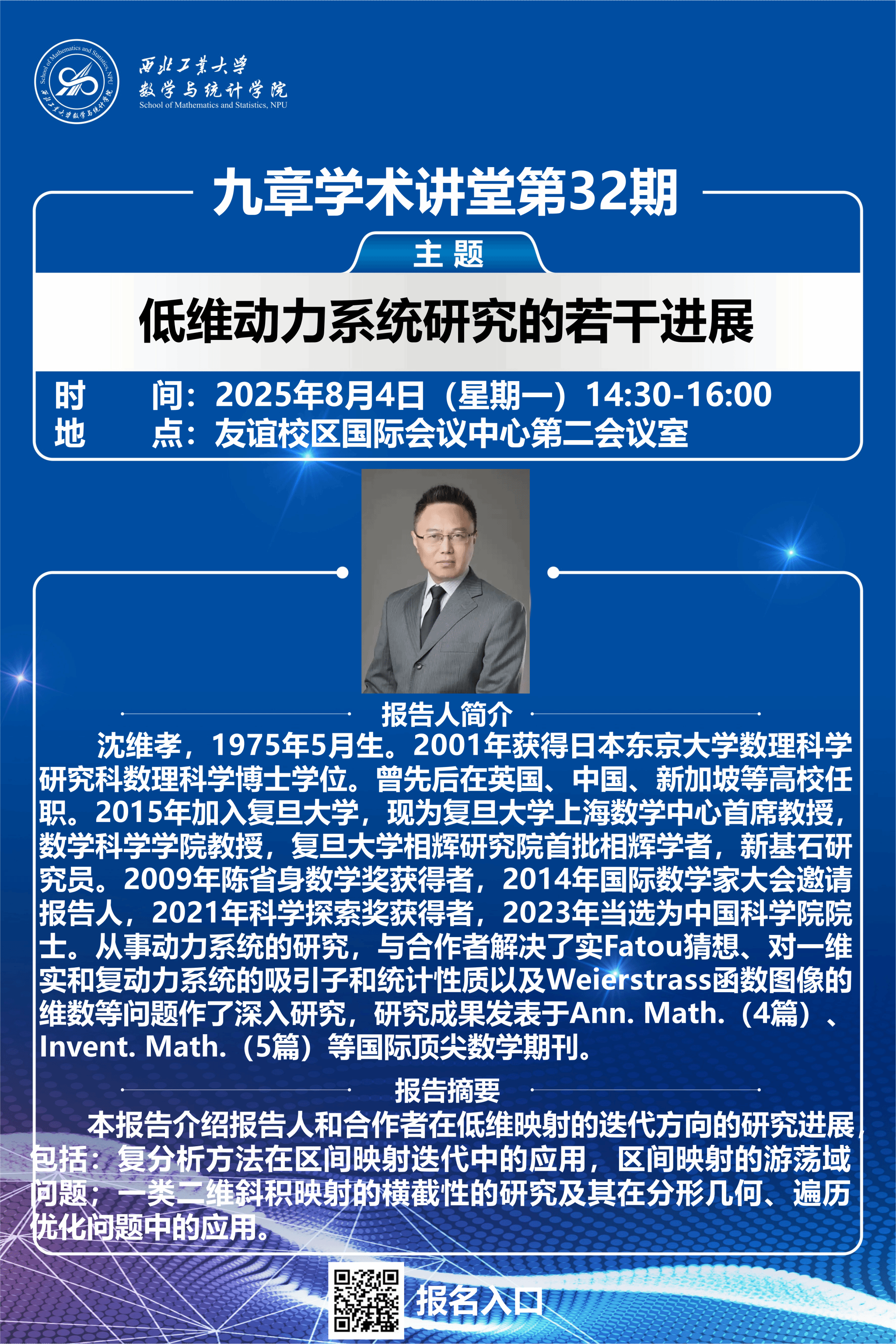 沈维孝,1975年5月生。2001年获得日本东京大学数理科学研究科数理科学博士学位。曾先后在英国、中国、新加坡等高校任职。2015年加入复旦大学,现为复旦大学上海数学中心首席教授,数学科学学院教授,复旦大学相辉研究院首批相辉学者,新基石研究员。2009年陈省身数学奖获得者,2014年国际数学家大会邀请报告人,2021年科学探索奖获得者,2023年当选为中国科学院院士。从事动力系统的研究,与合作者解决了实Fatou猜想、对一维实和复动力系统的吸引子和统计性质以及Weierstrass函数图像的维数等问题作了深入研究,研究成果发表于Ann. Math.(4篇)、Invent. Math.(5篇)等国际顶尖数学期刊。