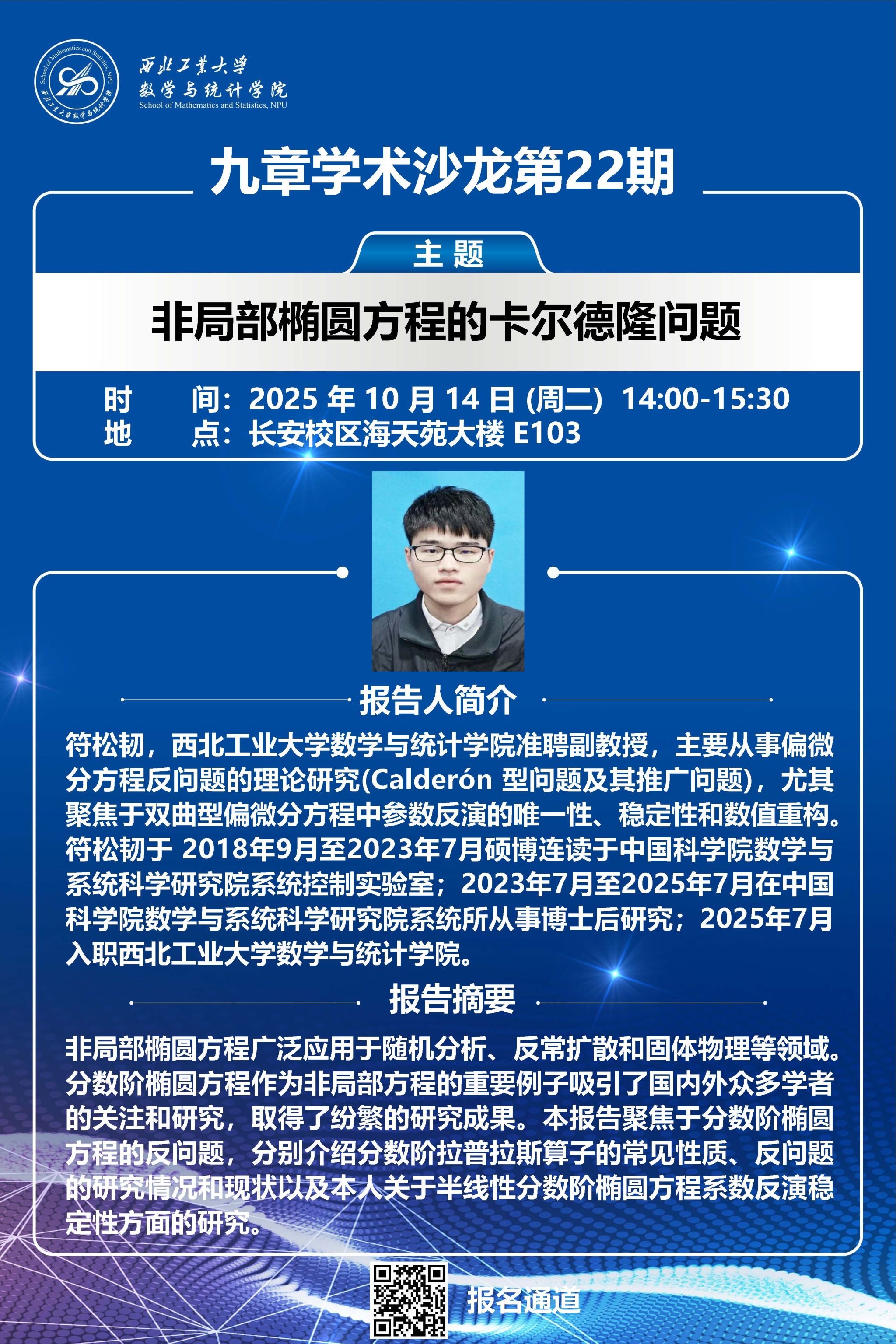 为促进学院教师之间的学术交流与合作,2025年10月14日,啪啪啦 顺利举办第22期“九章学术沙龙”。本期活动特邀啪啪啦 符松韧副教授作题为“非局部椭圆方程的卡尔德隆问题”的学术报告。报告会由夏健康副教授主持,吸引了学院十余位师生的积极参与。