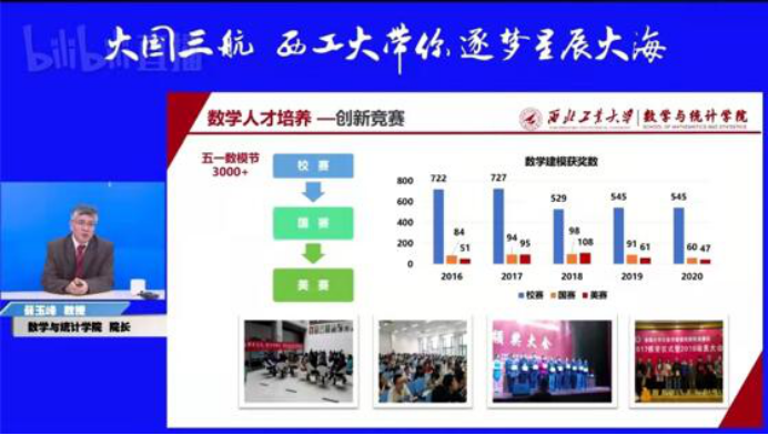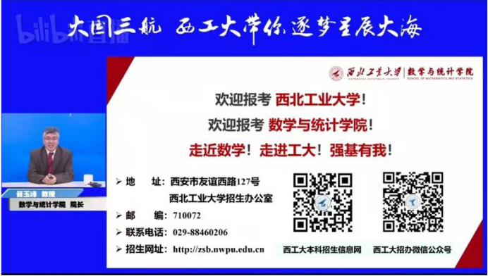 为进一步做好学校招生工作,应学校招生办公室邀请,2022年3月30日20:00,啪啪啦 院长聂玉峰教授做客《大国三航 西工大带你逐梦星辰大海》院长直播间,做了题为《走近数学 “强基”工大》的报告。本次报告在招办B站进行了现场直播,共有5000余人通过相关平台在线观看了此次报告。