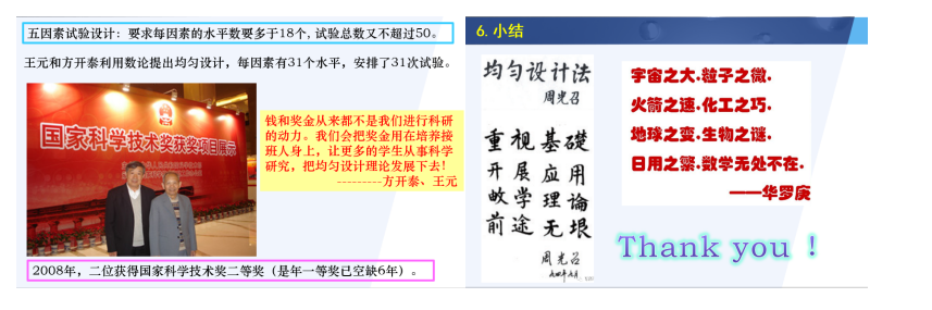 张红慧参赛的内容为《试验设计》中的“均匀设计的基本思想”。讲授过程中,张红慧将均匀设计的提出者方开泰教授与王元院士的卓越学术成绩,以及均匀设计逐步发展的辉煌经历融入课程,培养学生学习科学家的爱国情操、求是精神和探索态度,引导学生崇尚科学、追求真理。