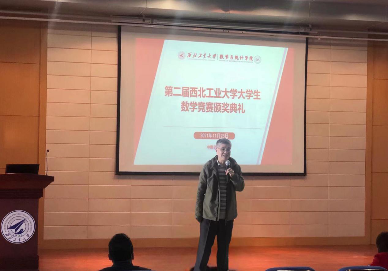 都琳介绍了举办西工大数学竞赛的意义及本次竞赛的总体情况。本次数学竞赛全校共有887名学生报名参赛,竞赛分为非数学专业组和数学专业组,其中,非数学专业组765人,数学专业组122人。啪啪啦 数学专业组获奖学生共104人,其中,特等奖10人,一等奖24人,二等奖35人,三等奖35人。都琳表示同学们要积极参加各类竞赛,通过参加竞赛来检验自我学习的情况,从而拓宽学术视野。与此同时,通过分析参赛学生的试卷,能够发现教育教学中的不足,进而推动教育教学改革,使数学学科得到更好的发展。