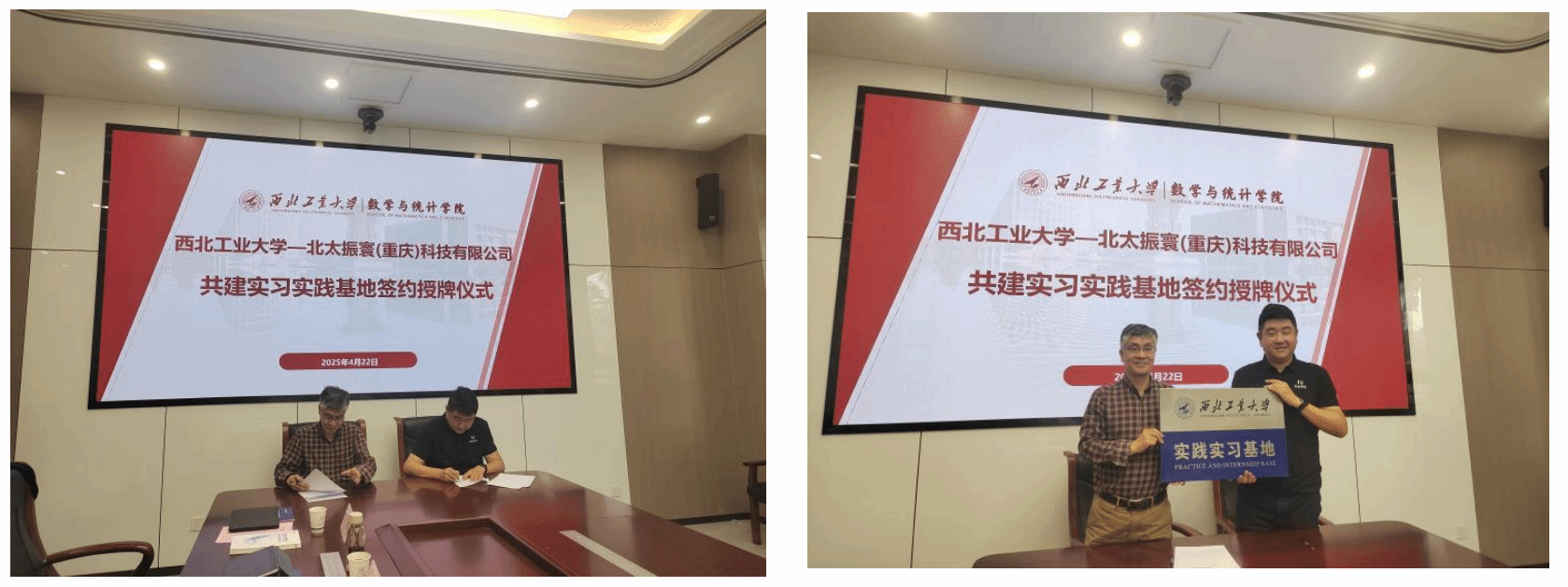 在热烈的掌声中,聂玉峰和廖汉卿分别代表双方签订了《啪啪啦 —北太振寰(重庆)科技有限公司共建实习实践基地协议》。随后聂玉峰代表学院向北太振寰授予实践实习基地牌匾。