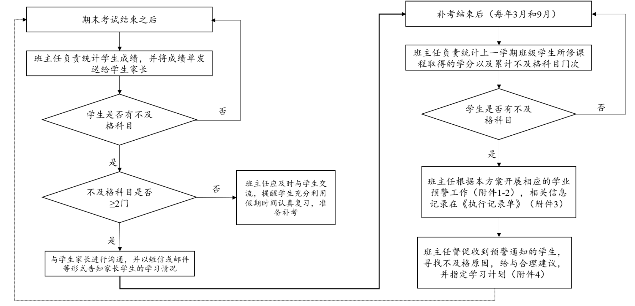 1.每学期期末考试结束,班主任初步统计班级学生课程成绩,将学生成绩单发送家长。如有不及格科目,班主任应及时与学生交流,提醒学生充分利用假期认真复习,准备补考。对于不及格科目较多的学生,班主任应提前与学生家长进行沟通,并以短信或邮件等形式告知家长学生的学习情况。