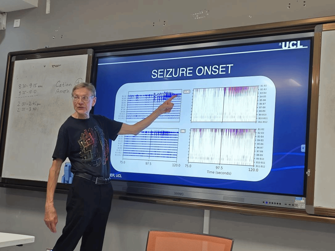 随后,Gerold Baier教授介绍了对癫痫患者单通道sEEG数据进行单变量分析的方法,强调了癫痫活动在频率、振幅和波形上的规律性和特征性。介绍了皮尔逊相关系数和Jensen-Shannon距离,用于评估不同脑电信号段之间的相似性。同时聚焦于EEG中的时空振荡现象,强调大脑活动的非重复性和非平稳性。整体而言,Gerold Baier教授通过数学模型和动态系统理论,深入分析了癫痫发作的动特征和可能的机制。