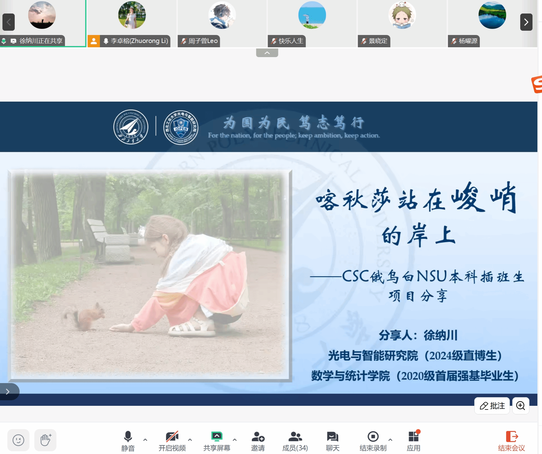 参加了学校俄乌白国际合作培养项目(本科插班生)的 2020 级强基班首届学生徐纳川同学,也来到了宣讲会现场,通过线上分享了他在俄罗斯新西伯利亚国立大学交流学习的宝贵经验与丰硕收获。徐纳川同学不仅讲述了在国外的学习生活点滴,还结合自身经历,对有志于参加国(境)外学习交流项目的同学们提出了实用的建议,让大家对海外学习生活有了更直观、更清晰的认识。