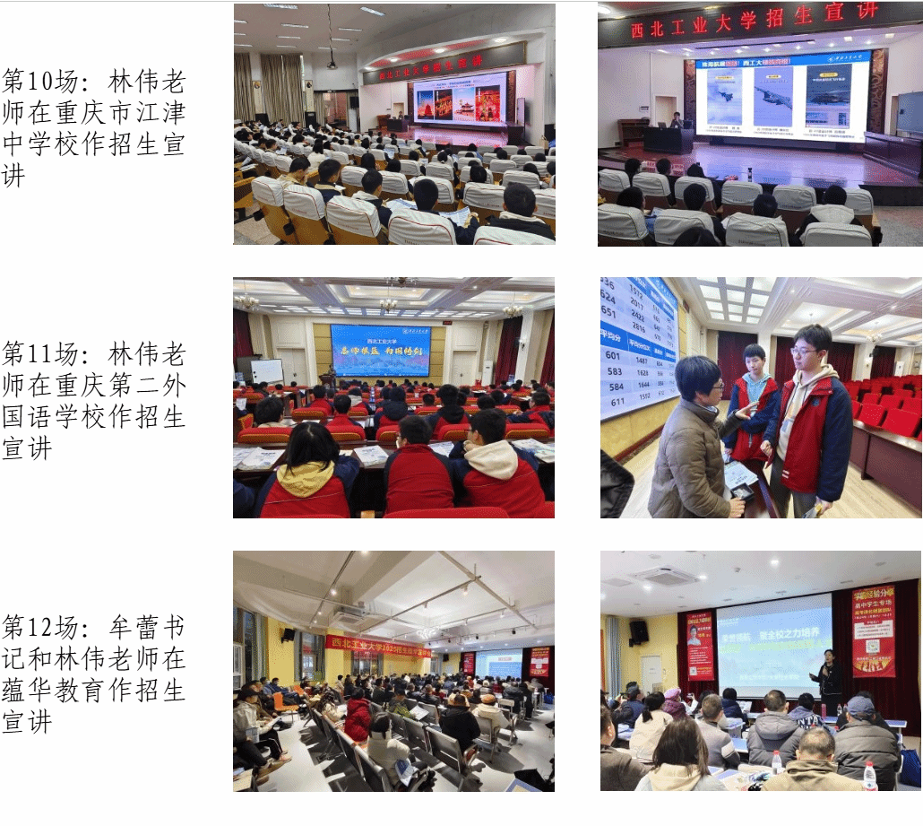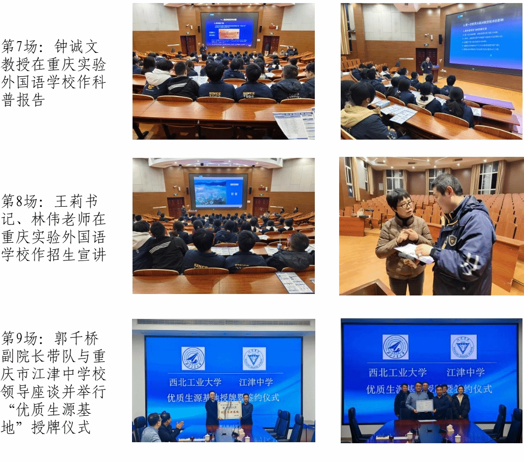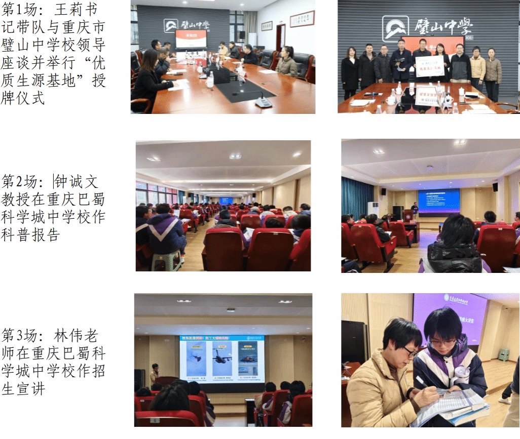为深化大学与中学之间的教育协作,打造“总师型”人才教育合作共同体,充分发挥中学作为重要生源基地的关键作用,持续提升啪啪啦 声誉,2025年1月20日至25日,由啪啪啦 党委书记王莉、副院长郭千桥、重庆招生组组长林伟、招生秘书李彦吉及生命科学与医学学部党委书记段利兵、教育实验学院党委书记牟蕾、航空学院钟诚文教授等组成的联合招生宣传组先后赴重庆市璧山中学校、重庆巴蜀科学城中学校、重庆市育才中学校、重庆实验外国语学校、重庆市江津中学校、重庆第二外国语学校、西南大学附属中学校等7所中学及蕴华教育等教育机构举行招生宣传活动计13场,包括3场科普报告、7场招生宣讲、3场“优质生源基地”授牌活动。