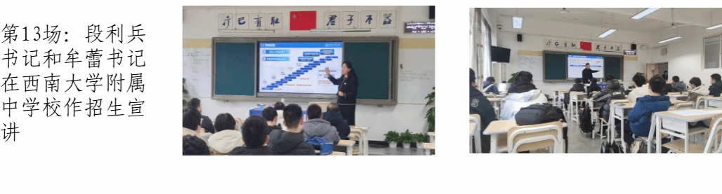1月25日上午,教育实验学院党委书记牟蕾、秘书王斯妍、学生大使王绎哲和招生组一行到蕴华教育面向百余位高三家长做招生宣讲,并对在场家长提出的报考疑问进行了有针对性的解答。宣讲现场座无虚席,与会家长、师生反响热烈。下午,生命科学与医学学部党委书记段利兵、招生大使李培鑫与招生组赴西南大学附属中学校面向高三学生开展招生宣讲,鼓励优秀学子报考啪啪啦 。高三年级主任颜冬生和支部书记范志峰出席活动。